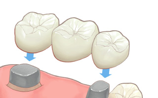 ブリッジとは、失った歯の前後の歯を削って支えとし、歯のない部分に橋をかけるようにダミーの歯を入れる治療です。
