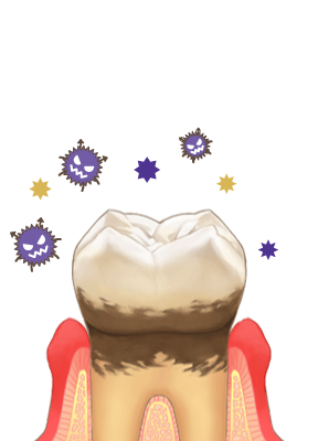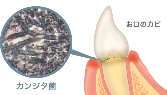 お風呂のカビと同様に、お口の中も適度な水分(唾液)と温度が保たれています。カビが発芽し、菌糸をつけていくのに最適な環境です。歯にわずかに付着した食べカスや歯石などを栄養源として、カビはどんどん成長していきます。 カビが歯周病の直接の原因となるわけではありませんが、歯周病菌の住み家となって菌を守ってしまうのです。 そのため、カビを死滅させるために特殊なカビ除菌用のお薬が必要となります。