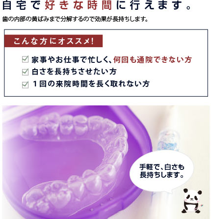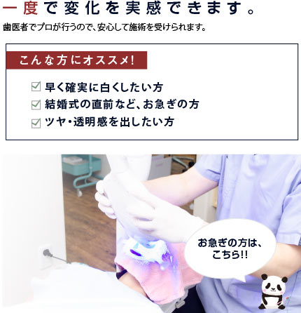 ささじま歯科では、歯がしみにくく色戻りがしにくい ホームホワイトニングと、急ぎの予定にも間に合うオフィスホワイトニングのどちらも行うことができます。