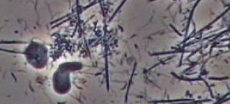 位相差顕微鏡で見るととても大きく、歯周病が重症の方のお口の中に多く見られます。白血球をたくさん食べています。